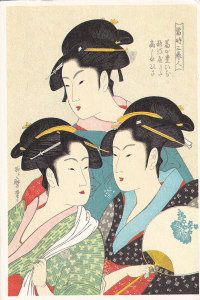 Das Motiv zeigt das Werk „Drei zeitgenössische Schönheiten“ von Kitagawa Utamaro (喜多川 歌麿). Der Künstler wurde 1753 (nicht sicher) geboren und starb im Jahr 1806. In Japan wurde er für seine Farbholzschnitte berühmt. In Japan wird diese Form der Kunst als Ukiyo-e (浮世絵, etwa „Bilder der fließenden Welt) bezeichnet, die sich allerdings nicht nur auf die bekannten Farbholzschnitte bezieht. Es gibt auch Gemälde, die zu dieser Kunstform gehören. So definiert Ukiyo-e das Genre der Werke, die das Lebensgefühl und die Weltsicht des aufkommenden Bürgertums und der breiten Bevölkerungsmehrheit in den großen Städten Japans (insbesondere Edo, jetzt Tokio) während der Edo-Zeit widerspiegeln.