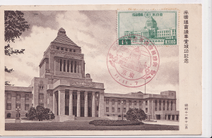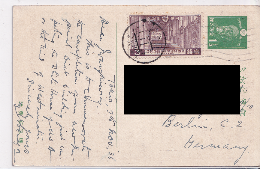 Die Ganzsache lief 1936 von Tokio (Japan) nach Berlin (Deutschland) und ist mit 6 Sen frankiert. Abgestempelt wurde die Ganzsache am 7. November 1936 mit einem Sonderstempel auf der Bildseite und einem weiteren Stempel auf der Vorderseite. Als Motiv dient das Parlamentsgebäude und auch die Nachricht handelt von der Vollendung des Neubaus.
